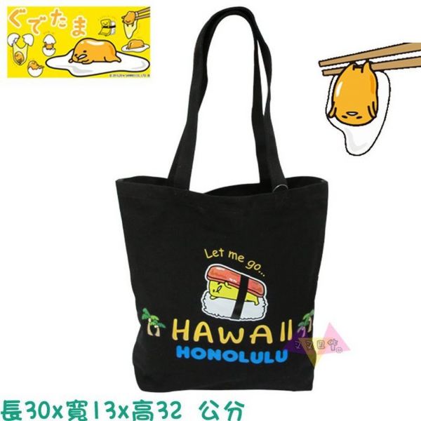 商品詳情 #SANRIO #三麗鷗 #GUDETAMA #蛋黃哥 #叉叉日貨 ★原價680 特價629★ 尺寸:長38x寬10x高65 公分 不含提袋尺寸:長38x寬10.5x高38【此賣場共1款】 品牌/產地:日本正版 / 中國 蛋黃哥 HAWAII夏威夷慵懶生魚片壽司玉子燒黑底肩背購物袋托特包A4可 TWD $629 TWD $629