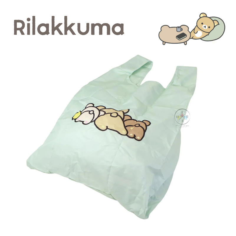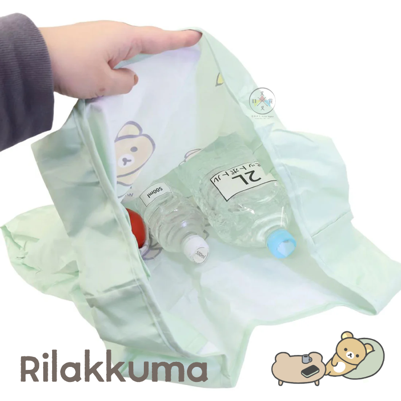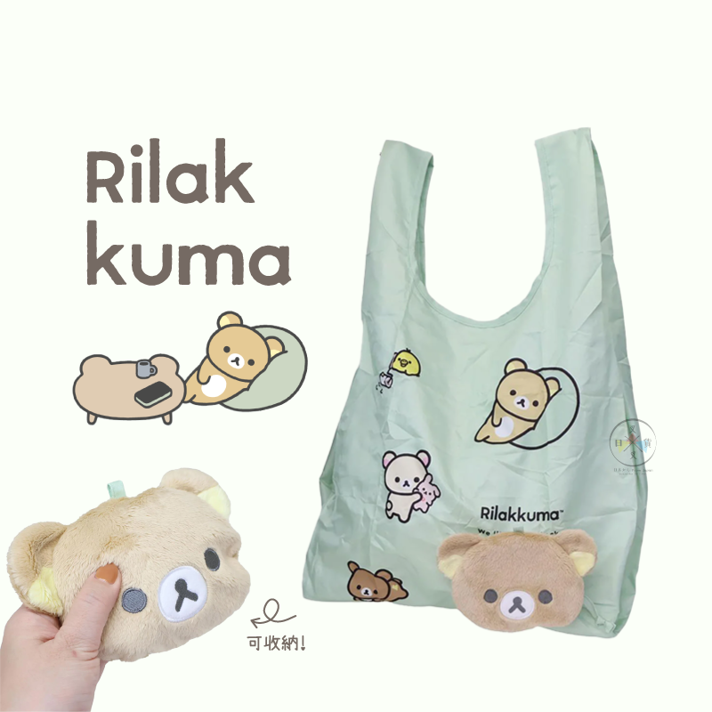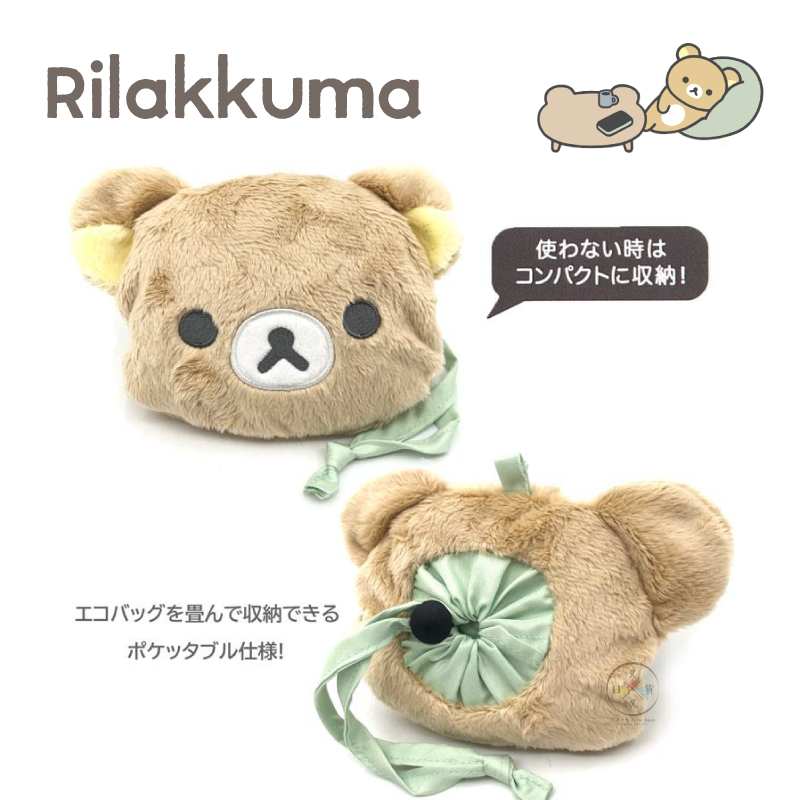 可將購物袋摺疊後收納進拉拉熊的臉型收納袋中