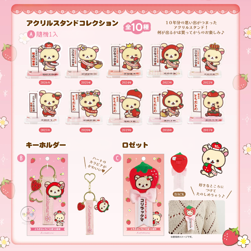 | 款式 | A壓克力立牌 全10款 盲抽 隨機1入/B金屬吊飾 飄帶 登山扣 鑰匙圈/C榮譽獎章 別針/D陶瓷飾品盤/E仿皮刺繡零錢包 附金屬鍊/F仿皮 卡片夾零錢包/G1絨毛吊飾 登山扣代言人背帶/G2絨毛吊飾 登山扣 抱草莓/H1絨毛娃娃 代言人背帶/H2絨毛娃娃 採草莓 |