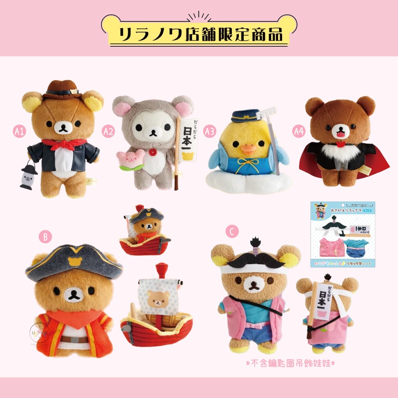 | 款式 | A1絨毛玩偶 探險家懶懶熊/A2絨毛玩偶 猴子懶妹/A3絨毛玩偶 沙悟淨小雞/A4絨毛玩偶 吸血鬼蜜茶熊/B絨毛玩偶 金銀島場景組 懶懶熊船長/C娃衣 桃太郎 4件組 |